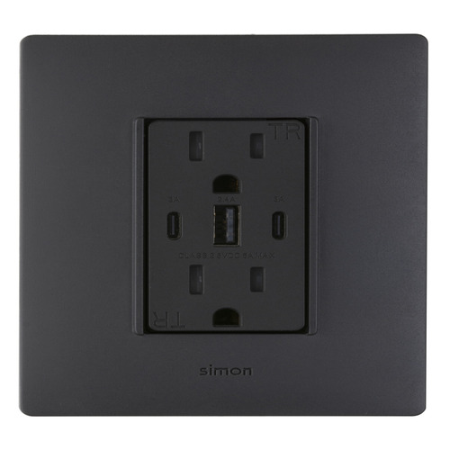 La Placa Nema con Toma de Corriente Dúplex C/USB de 10A y 127V~ en color grafito mate de la línea Simon 26 es la solución perfecta para quienes necesitan una carga eficiente y segura para sus dispositivos electrónicos. Equipado con un sistema de protección para niños y un chip inteligente, este receptáculo USB optimiza la potencia de carga, haciendo que la carga de tabletas, teléfonos, dispositivos de juegos y más, sea rápida y efectiva.